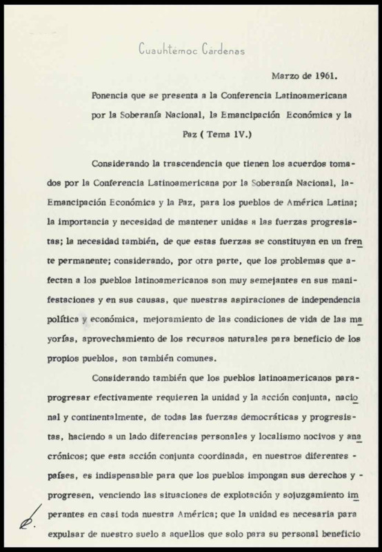 - Ponencia que se presenta a la Conferencia Latinoamericana por la Soberanía Nacional, la Emancipación Económica y la Paz (Tema IV). Dos telegramas, uno del general Lázaro Cárdenas en que informa que recibió cartas de Cuauhtémoc y otro para [Amalia Solórzano] informa asunto en Cuba.