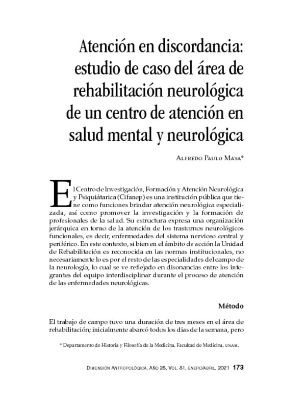 - URL Atención en discordancia: estudio de caso del área de rehabilitación neurológica de un centro de atención en salud mental y neurológica. Dimensión Antropológica Vol. 81 (2021)
