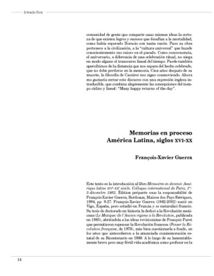 - Este texto es la introducción al libro Mémoires en devenir. Amérique latine XVIe-XXe siècle. Colloque international de Paris, 1er 3 décembre 1992. Édition préparée sous la responsabilité de François-Xavier Guerra, Bordeaux, Maison des Pays Ibériques, 1994, pp. 9-27. François-Xavier Guerra (1942-2002) nació en Vigo, España, pero estudió en Francia y se naturalizó francés. Su tesis de doctorado en historia la dedicó a la Revolución mexicana (Le Mexique: de l’Ancien régime à la Révolution, publicada en 1985), abriéndola a las ideas revisionistas de François Furet que permitieron repensar la Revolución francesa (Penser la Révolution française, de 1978), más bien cuestionarla a fondo, en los años que antecedieron a la anunciada conmemoración estatal de su Bicentenario en 1989. A lo largo de su lamentablemente breve pero muy fértil vida académica como profesor en la Sorbona, Guerra fue un gran investigador y maestro. Compartió con sus no pocos discípulos y colaboradores su rigurosa reflexión y su amplio programa de investigaciones sobre el tránsito del Antiguo Régimen al Nuevo, ampliada al conjunto del mundo ibérico desde el siglo XVIII. Este tránsito implica el paso de los espacios imperiales a los nacionales, del súbdito al ciudadano, del corporativismo al individualismo, y un cambio también de las memorias políticas, traídas a cuenta por la conmemoración del Quinto Centenario de 1992. El presente panorama del “devenir” de las memorias latinoamericanas en el periodo colonial, el siglo XIX y el XX nos ayuda a repensar la memoria mexicana en nuestra doble conmemoración centenaria de 2010. La traducción y nota son de Rodrigo Martínez Baracs.