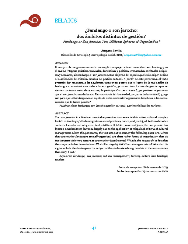 - The son jarocho is a Mexican musical expression that arose within a vast cultural complex known as fandango, which integrates musical practices, dance, and poetry, all within a broader context of secular and religious ritual activities. However, in recent years, the son jarocho has become detached from its roots, largely due to the application of misguided criteria of cultural management. Given this panorama, the text sets out to answer the following questions. Given that community fandangos are self-organized, are there other forms of organization that do not threaten their very nature as community-based events? What is the impact of the fact that the son jarocho has been declared World Heritage by UNESCO on its organization? Would striv-ing to include the fandango as the subject of this declaration bring benefits to the communities that carry it out?