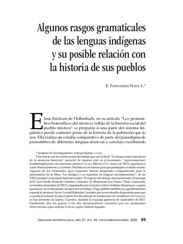 - URL Algunos rasgos gramaticales de las lenguas indígenas y su posible relación con la historia de sus pueblos. Dimensión Antropológica Vol. 80 (2020)