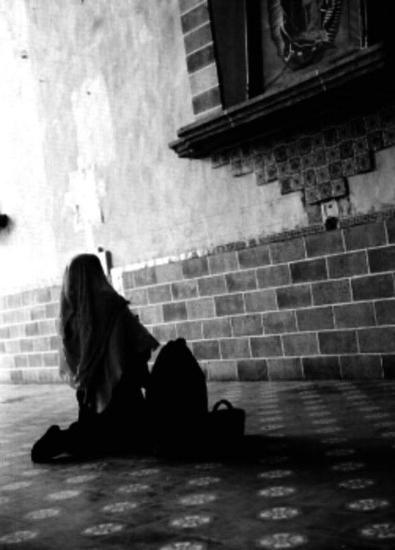 - Mujer arrodillada ante una imagen de la virgen de Guadalupe en la iglesia de Zacatlán