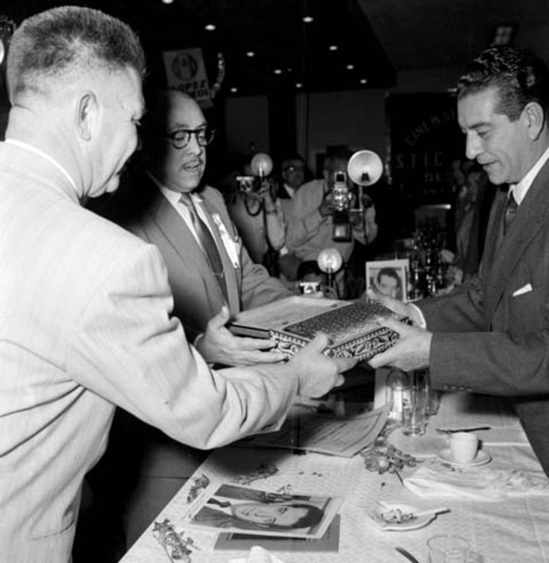 - López Mateos recibiendo artesanía obsequiada por el club de leones.