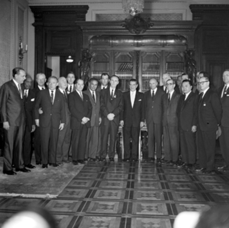 - Adolfo López Mateos y legisladores norteaméricanos en un salón de Palacio Nacional, retrato de grupo.