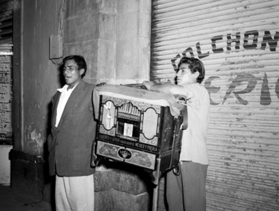 Mendigo y cilindrero en una acera