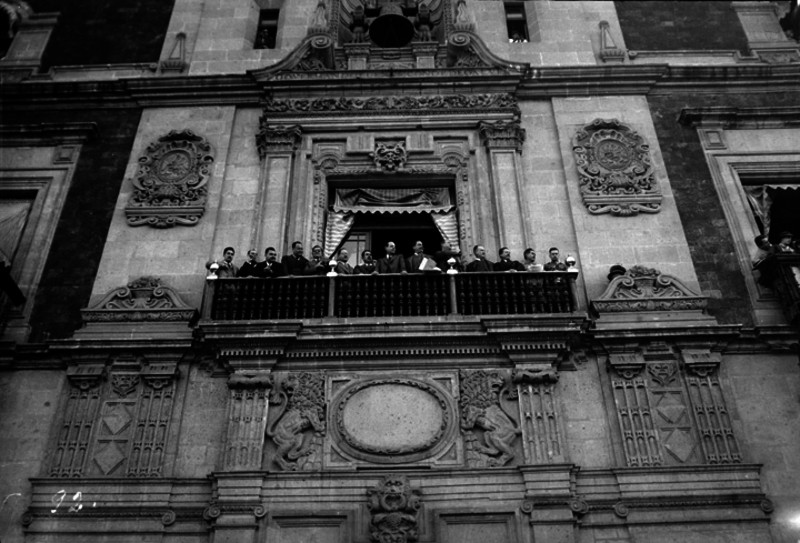 - Abelardo L. Rodríguez acompañado por Aarón Sáenz, Lázaro Cárdenas y otros funcionarios en el balcón presidencial