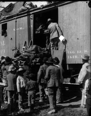 - Hombres suben a herido en camilla a carro de ferrocarril