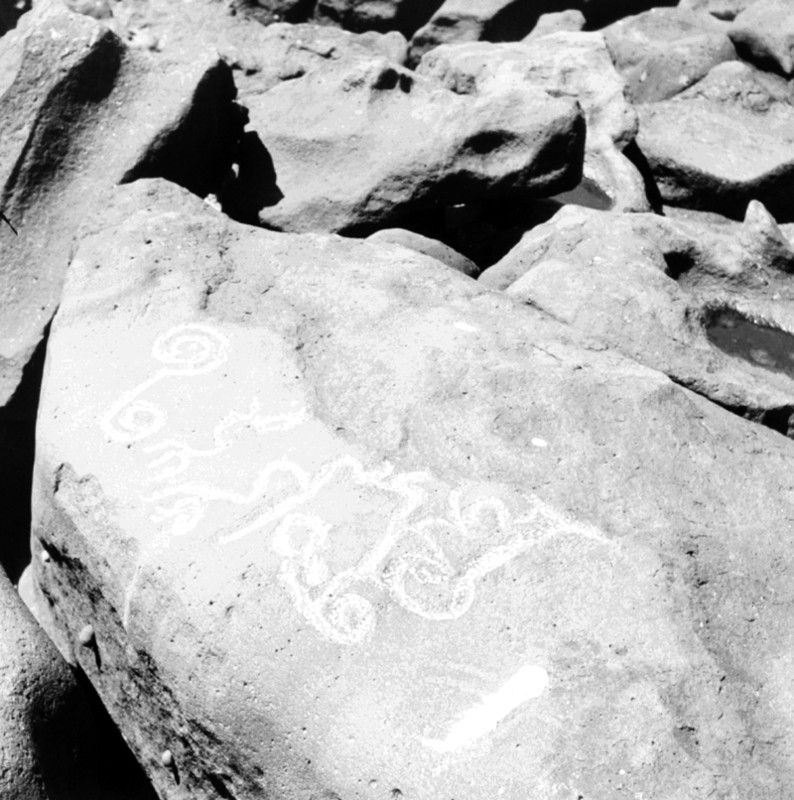 Vista de petroglifo en el sitio de Las Labradas en San Ignacio, Sinaloa, reprografía