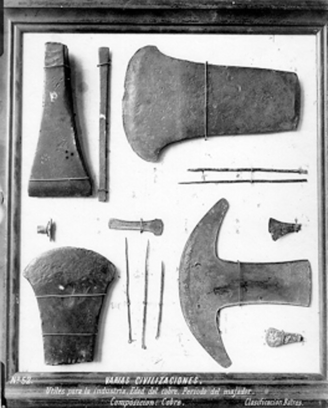- I.O. Anverso: "N°. 52", "Varias civilizaciones", "Utiles para la industria. Edad del cobre. Periodo del majador", "Composición: Cobre", "Clasificación: Batres". Reverso: "2613".