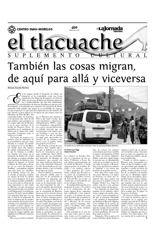 - También las cosas migran, de aquí para allá y viceversaanuncia por Adriana Saldaña Ramírez. -¿Donde está registrado Teocuicani o “cantor divino” por Fray Diego de Durán? por Alfredo Paulo Maya y Raúl Francisco González Quezada. -Rescatando Zazacatla por Giselle Canto Aguilar, Georgia Yris Bravo López