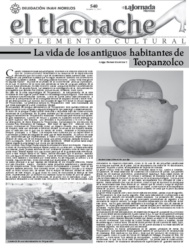 - La vida de los antiguos habitantes de Teopanzolco por Barbara Konieczna Z. -Historias de Morelos, Tierra, gente, tiempos del Sur por Miguel Morayta M. -Intercambio reciente de culturas en Xochicalco por José Cuauhtli A. Medina Romero.