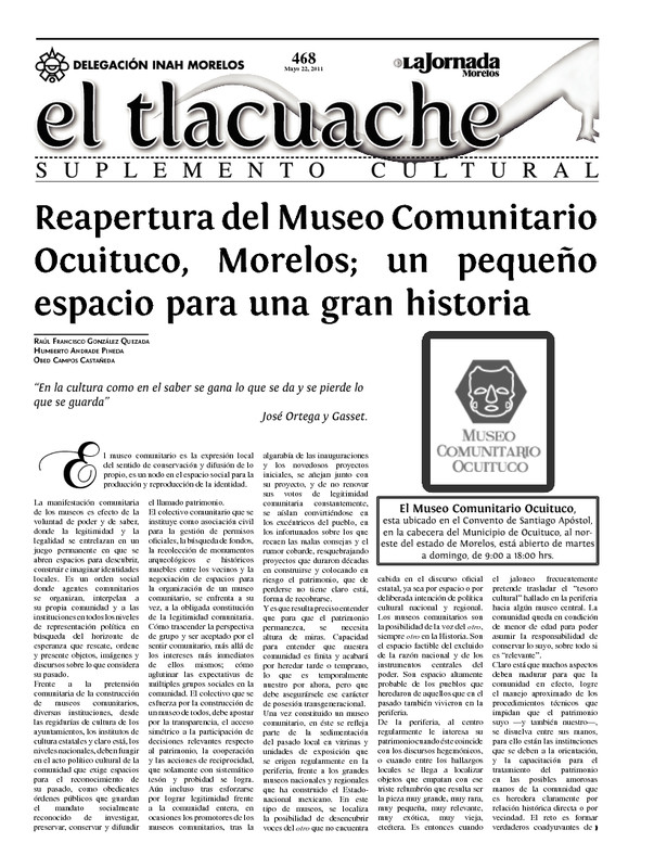 - Reapertura del Museo Comunitario Ocuituco, Morelos; un pequeño espacio para una gran historia por Raúl Francisco González Quezada, Humberto Andrade Pineda, Obed Campos Castañeda. -Para saqueadores, coleccionistas, arqueólogos y público en general por Mauricio Valencia Escalante.