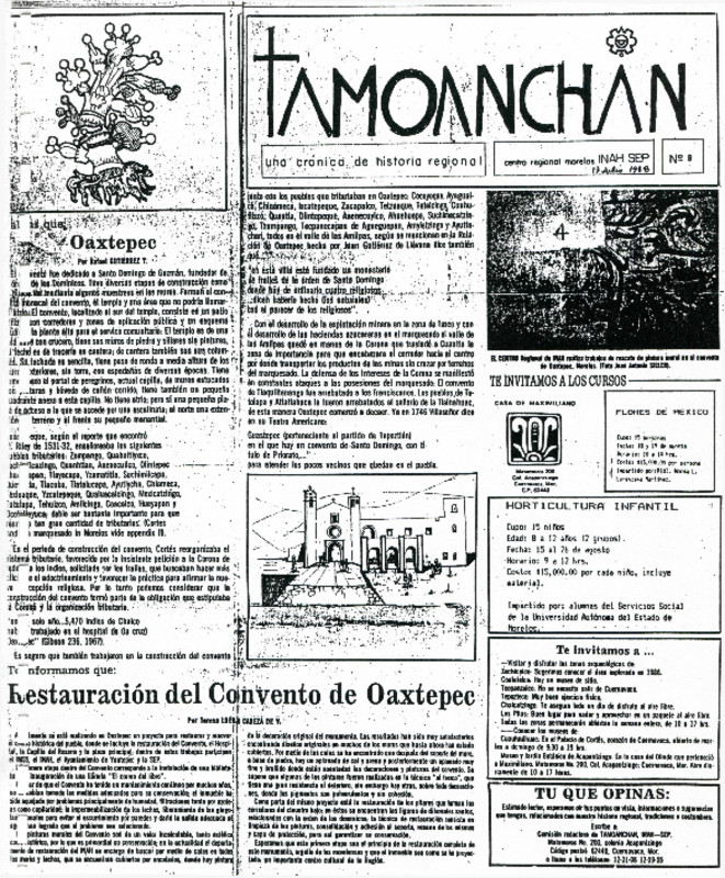 - - Oaxtepec por Heladio Rafael Gutiérrez Yáñez. - Restauración del Convento de Oaxtepec por Teresa Loera Cabeza de Vaca.