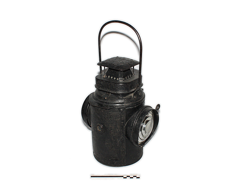 - Farol de ferrocarril de cuerpo cilíndrico con dos bombillas circulares diametralmente opuestas, en la parte superior la tapa remata con el asa de la piezas. Sobre la tapa se lee "THE ADLAKE NON - SWEATING LAMP CHICAGO". Pintada en color negro.