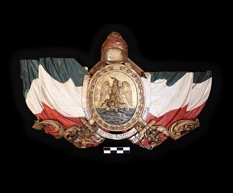 Bandera de México tallada en madera con escudo en relieve al centro y rematado en la parte superior con un gorro frigio. El escudo se rodea de la leyenda " CARBONERA Octubre 18 de 1866, MEXICO Junio .. De 1867, TECOAC Noviembre 16 de 1876, PUEBLA Abril 2 de 1867" "LIBERTAD Y CONSTITUCION".