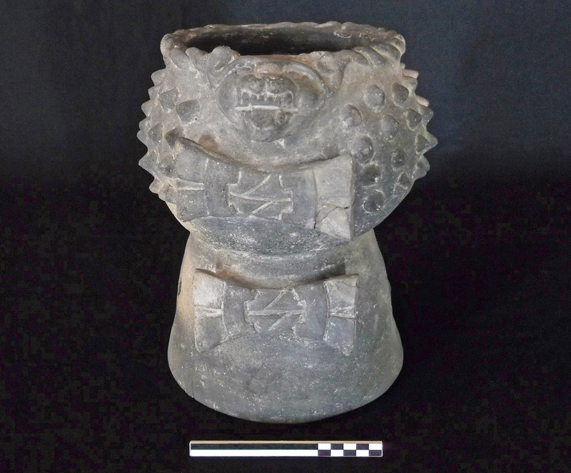 - Brasero con pedestal cónico que presenta perforaciones laterales diametralmente opuestas, cuerpo globular con el borde en forma de cordel, con aplicaciones frontales que representan dos moños acompañados de una cabeza de jaguar y el cuerpo cubierto de aplicaciones cónicas. Elaborado en pasta gris alisada con manchas de cocción.