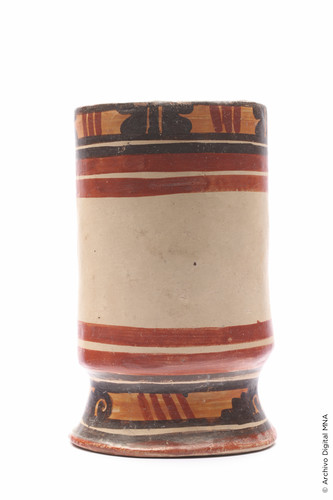 - VASO DE CUERPO RECTO, BASE CONVEXA, FONDO CÓNCAVO, BOCA CIRCULAR, BORDE REDONDEADO, CON SOPORTE DE PEDESTAL CÓNICO TRUNCADO. DECORADO CON BANDAS HORIZONTALES PARALELAS, GRECAS Y LÍNEAS VERTICALES Y DIAGONALES PARALELAS.
