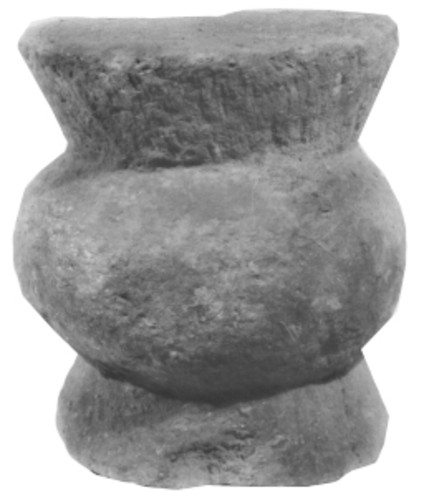 - BALAUSTRE DE CUERPO SEMIESFÉRICO SÓLIDO, CON DOBLE SOPORTE DE PEDESTAL RECTO DIVERGENTE, CON UN CORTE RECTO POSTERIOR LONGITUDINAL, MITAD DE LA PIEZA EN FORMA DE MEDIA CAÑA PINTADA EN COLOR ROJO.