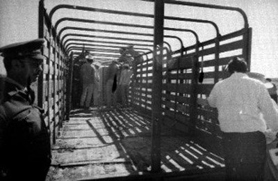 Trabajadores observan a rumiante después de bajarlo de un camión ...