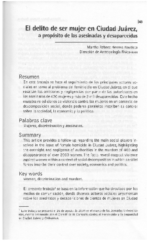 - EI delito de ser mujer en Ciudad Juarez, a propósito de las asesinadas y desaparecidas
