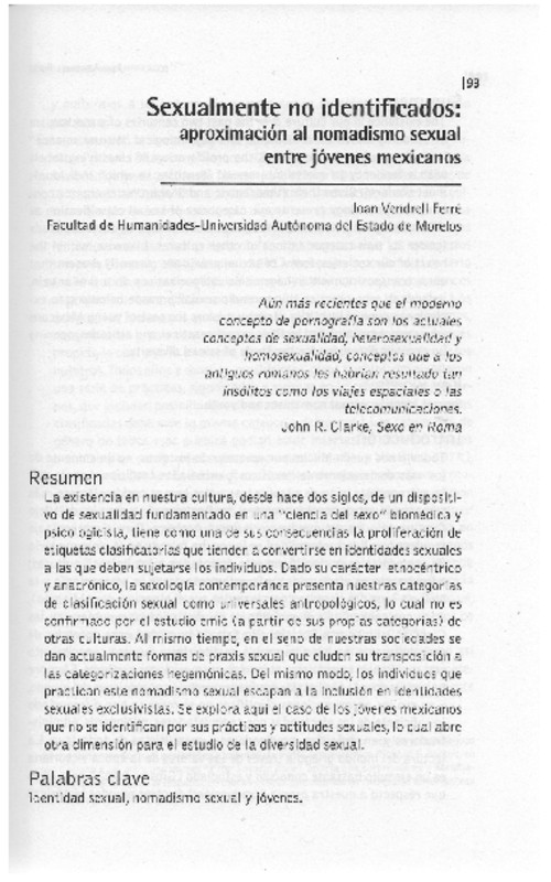 - The existence in our culture over the past two centuries of a mechanism of sexual ity based on a biomedic and psychological "sexual science" has as one of its consequences the proliferation of classifying labels with a tendency to evolve into sexual identities to which individuals must conform. Given their ethnocentric and anachronic character, contemporary sexology presents our categories of sexual classification as anthropological universals, something not confirmed by the emic study (under its own categorization) of other cultures. Likewise, within the heart of our societies, forms of sexual praxis are currently present that elude transposition within hegemonic categorizations. In a similar vein, individuals who practice this nomadic sexuality evade belonging to ex clusionary sexual identities. Here we explore the case of young Mexicans who cannot be identi fied by their sexual practices and attitudes, opening up another dimension for the study of sexual diversity.