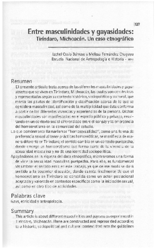 - This article is about different maseulinities and gayness as experienced in Tiríndaro, Michoacán. These are construeted and represented acording to a historic, sociopolitical and cultural context that sets the guidelines for identification and classification regarding what is considered to be masculinity as well as the multiplicity constituted by each individual's different lifestyle and experience. Said masculinities are manifested in public and private spaces, resulting in a social context that differentiates between being gay and the emergence of homoerotism within the community studied here. What we would generally term "homosexuality" as a form of sexual preference that consists of sustaining homoerotic practices, is manifested differently in Tiríndaro; its significance changes within a Purepecha context in which homoerotism emerges as part of the masculine sexual lifestyle, rather than a sociopolitical identity. Based on an abundance of ethnographic data, we will demonstrate the way in which Purepecha masculine sexuality is experienced. To this end, it is fundamental that the emic meaning of this work be considered, given that this will add significance to any later discussion, eventually with the realization that homoerotism in Tiríndaro has been consolidated as an accepted role in the population and is valued within specific contexts such as sexual initiation, among other activities.