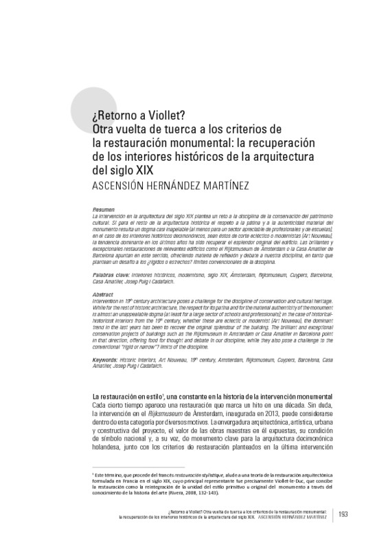 - ¿Retorno a Viollet? Otra vuelta de tuerca a los criterios de la restauración monumental: la recuperación de los interiores históricos de la arquitectura del siglo XIX
