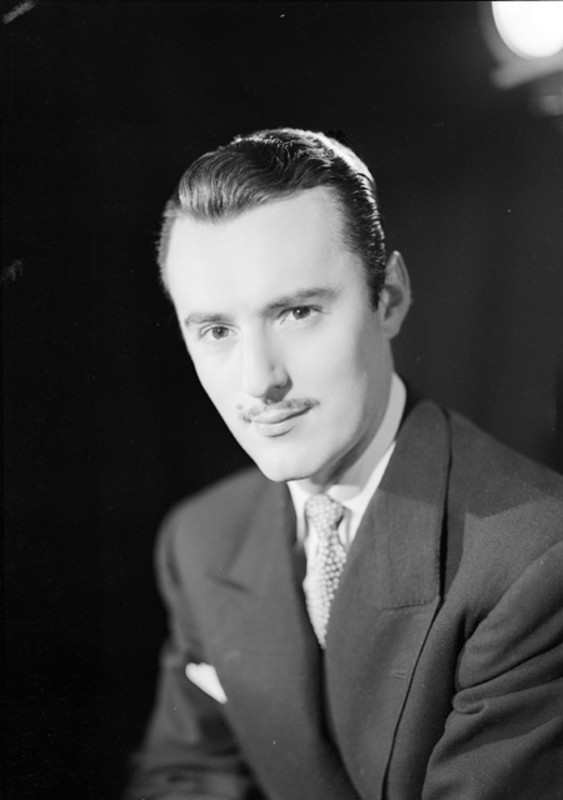- Manolo Fabregas, en tres cuartos de perfil con traje formal, retrato