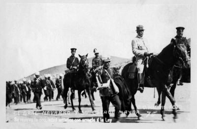 - Escrito en la guarda: " 25D03 Jorge Guerra REvolución Maderista tropas federales y revolucionarias 5/A/1". I.O. "EL GRAL NAVARRO Y SU ESTADO MAYOR 75", "Se reserva la sociedad artistica con arreglo á la ley" "C.C. HARRIS". Esta imagen aparece en la página 244 del tomo 1 en la Historia Gráfica de la Revolución Mexicana. En el pie de foto dice: "El general Juan J. Navarro al frente de sus tropas va en persecusión de los revoluicionarios". Catalogador: G. Gtz. 11/01/10.
