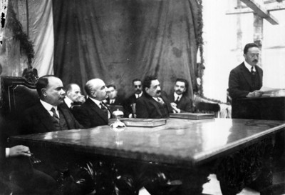 Alvaro Obregón escucha discurso de José Vasconcelos durante una ceremonia