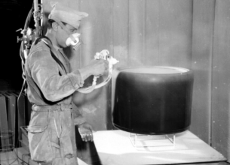 Obrero pintando la tina de una lavadora en la planta industrial FERRO ENAMEL