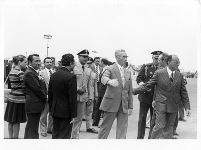 - Incremento Acervo Fototeca. Positivo. I.O. Al reverso de la imagen con letra manuscrita: "El Presidente de México, Luis Echeverría (1° de derecha a izquierda) con el Presidente de Guatemala (2° de derecha a izquierda) a la llegada de éste al aeropuerto de la cd. de México" Sello: "23 JUN. 1976" "C.3 S.29 f.26". V.F. 833383, 833435, 833436. En la comitiva de trás de los presidentes además de la guardi apresidencial está el embajador de México en Washington EUA, José JUan de Olloqui y detrás del presidente Echeverría, se encuentra García Robles, Secretario de Relaciones Exteriores.