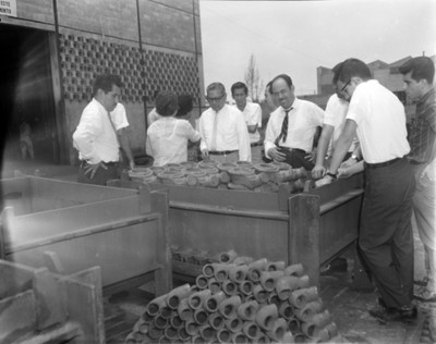 - Hombres observan piezas de maquinaria durante visita a planta automotríz