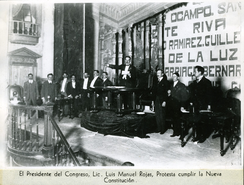 - Lic. Rojas protestando; traje, documento en la mano, escritorio, diputados reunidos, vestimentas, bigotes, rasgos faciales, piso, estrado, barandal de madera, escalones, decoración, balcón, nombres de personas en la pared de fondo
