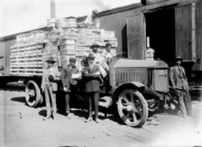 Hombres de pie junto a un camión de carga que transporta paquetes