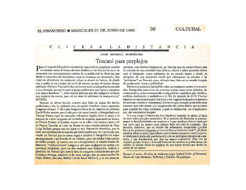 - Nota sobre la exposición Toscani al muro. 10 años de imágenes para United Color of Benetton que se presentó en el Museo de Arte Moderno en junio 1995.