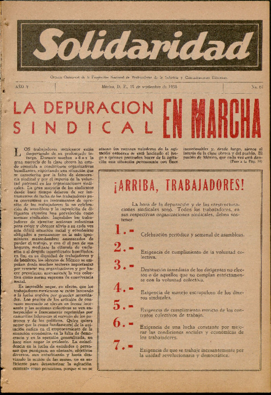 - Solidaridad. Órgano Quincenal de la Federación Nacional de Trabajadores de la Industria y Comunicaciones Eléctricas Núm. 67 Primera época (1958) septiembre