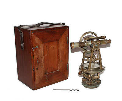 - Teodolito manufacturado en bronce con platillo para nivelar, brújula, 3 niveles de burbuja y mirilla. La caja de madera con asa de piel remachada y puerta de bisagras, al interior presenta perforaciones de clavo, con una perforación donde se localizaba la chapa. Tiene grabado el número XV sobre la mirilla, en la brújula se lee " C.L. Berger & Sons Boston U.S.A. 13441" "PATD Nov 3-1914" y el simbolo de la casa fabricante, en un tornillo se incribe "Lifter"