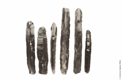 NAVAJILLAS PRISMÁTICAS TALLADAS EN OBSIDIANA (LOTE DE 41; 6 DE ELLAS EXHIBIDAS EN SALA).
