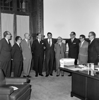 Alfonso Caso y otros funcionarios durante una reunión en una oficina ...
