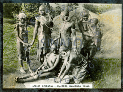 Grupo de mujeres de "África Oriental" muelen trigo, retrato de grupo ...