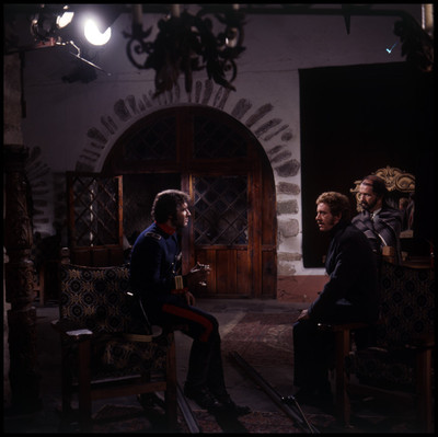 Farnesio de Bernal se dirige a unos soldados, durante escena de la película El Señor de Osanto ...