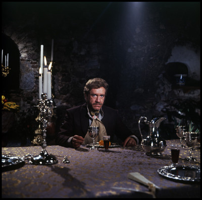 Actriz sirve bebida a Hugo Stiglitz durante escena de la película El Señor de Osanto ...