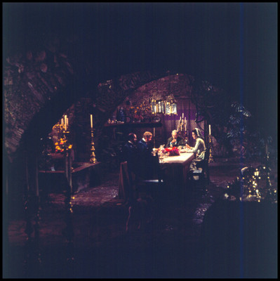 Actores sentados a la mesa durante escena de la película El Señor de Osanto ...