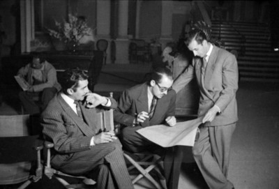 María Félix conversando con directores y productores de cine durante el rodaje de la película ...