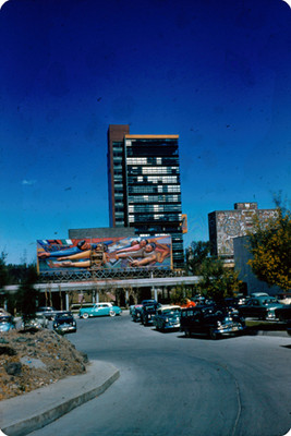 Torre de Rectoría, mural, libreria y zona comercial, UNAM, vista desde el estacionamiento de la Facultad de Arquitectura ...