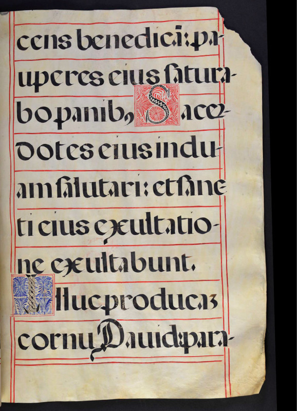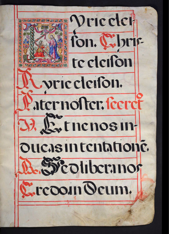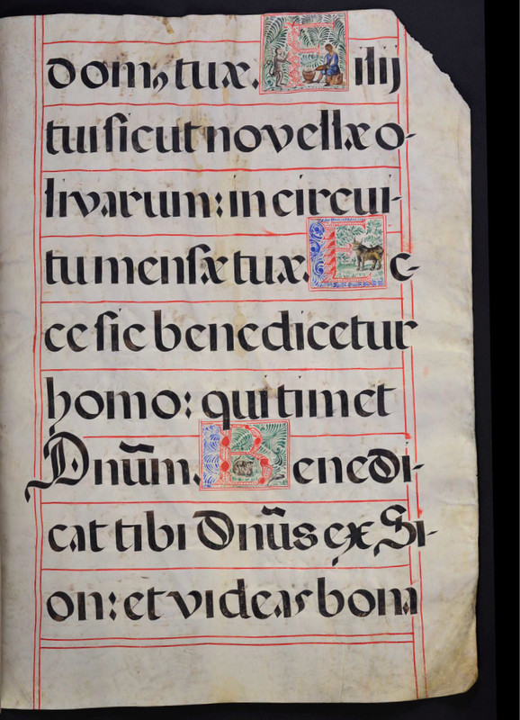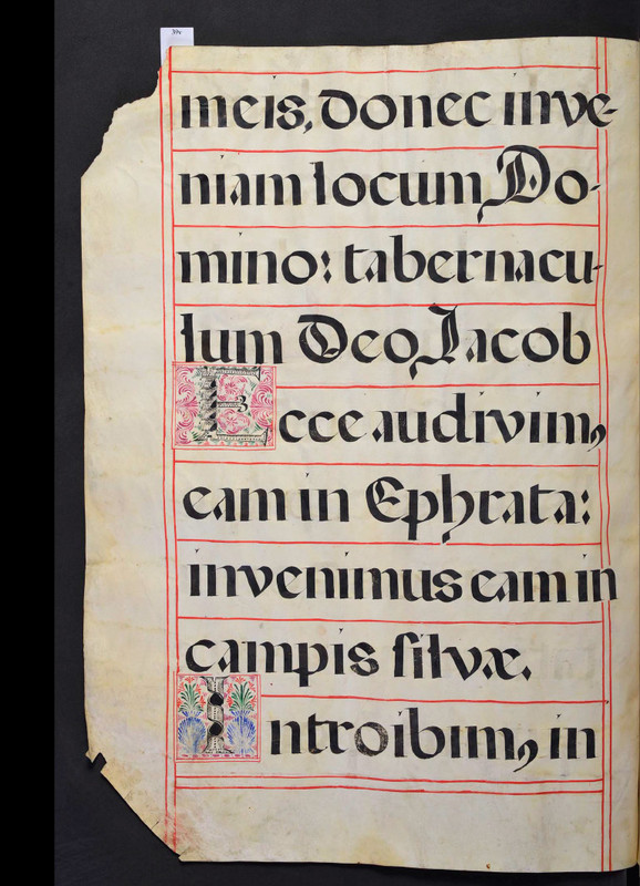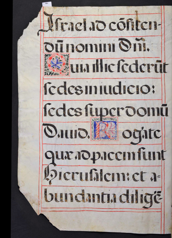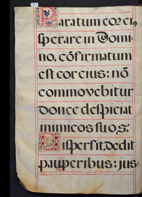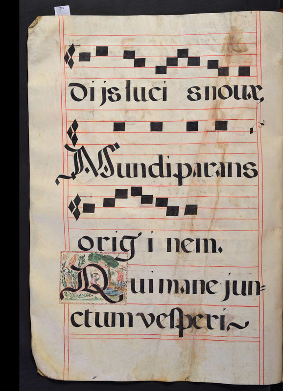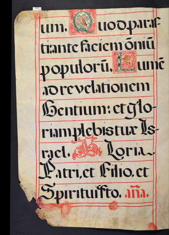- Con datos en el colofón del comitente, Diego de Malpartida y Zenteno; así como el lugar y la fecha, México, mayo de 1689. Caligrafía: el estilo caligráfico predominante es letra gótica. Se trata de un ejemplar con decoración abundante. Hay gran variedad de formas de letras y decoraciones. Tiene letras capitales iluminadas (historiadas), algunas con dorado; y letras secundarias con decoraciones muy variadas. Hay iluminadas (historiadas, con decoración dorada, con caja y enmarcadas con motivos geométricos), lombardas, taraceadas, lacería (con decoración y caja) y letras llenas de decoración geométrica. Reparaciones históricas: hay reposición de faltantes en esquinas de los folios con fragmentos de pergamino unidos al soporte en forma de peine.
