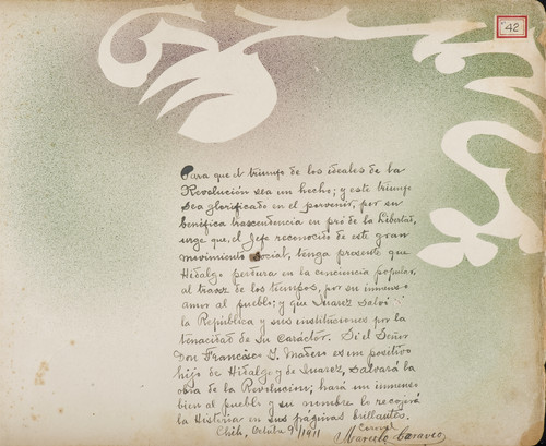 - "Para que el tiempo de los ideales de la Revolución sea un hecho; y este tiempo sea glorifciado en el porvenir, por su benéfica trascendencia en pro de la Libertad, urge que el Jefe reconocido de este gran movimiento social tenga presente que Hidalgo perdura en la conciencia popular, al través de los tiempos, por su inmenso amor al pueblo; y que Juárez salvó la República y sus instituciones por la tenacidad de su carácter. Si el Señor Don Francisco I. Madero es un positivo hijo de Hidalgo y de Juárez, salvará la obra de la Revolución; hará un inmenso bien al pueblo y su nombre recojerá la Historia en sus páginas brillantes. Chih., Octubre 9/1911. Coronel Marcelo Caraveo”.