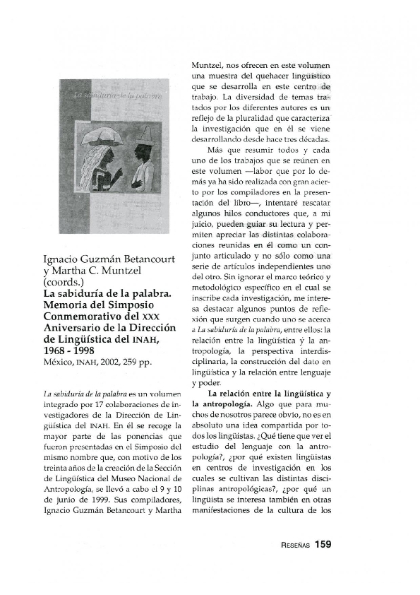 Ignacio Guzmán Betancourt y Martha C. Muntzel (coords.), La sabiduría de la palabra. Memoria del Simposio Conmemorativo del XXX Aniversario de la Dirección de Lingüística del INAH, 1968 - 1998, México, INAH, 2002, 259 pp.