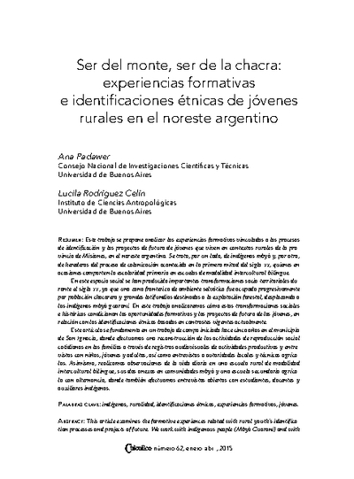 - Ser del monte, ser de la chacra: experiencias formativas e identificaciones étnicas de jóvenes rurales en el noreste argentino